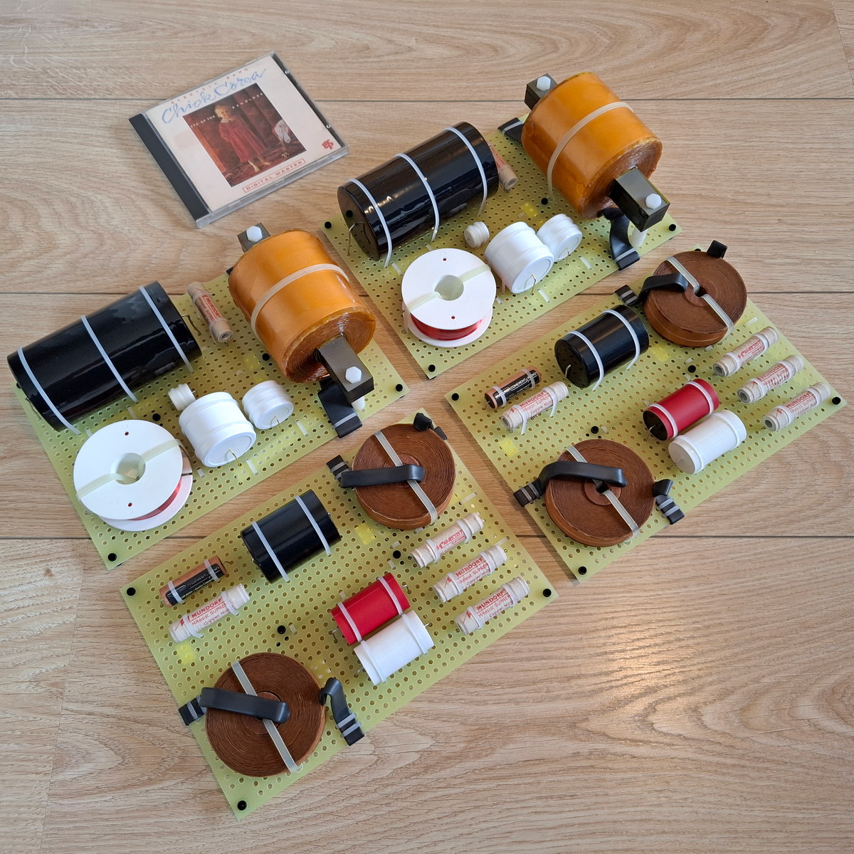 Een gematchde paar Mezzo Calpamos Deluxe filters (L1 + C1 upgrade + aparte printplaten voor laagdoorlaat en hoogdoorlaat filters).